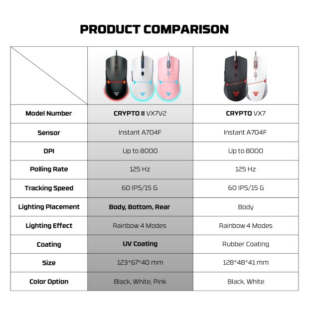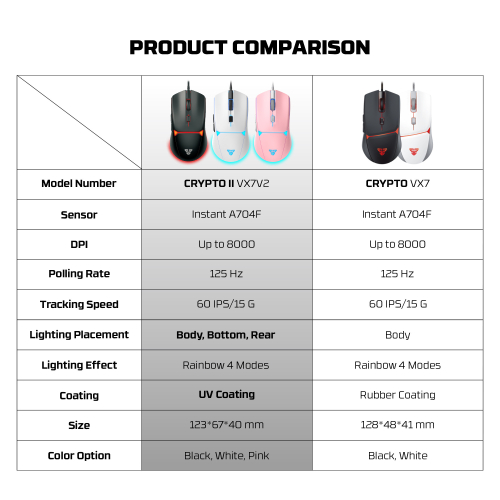 - 8,000 DPI - 6 programmable buttons - 10 millionn clicks - LED: Rainbow - Grippy coating
