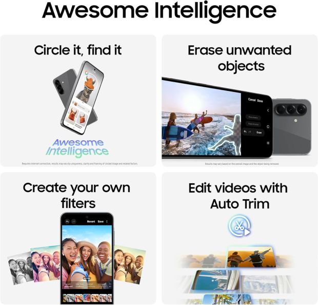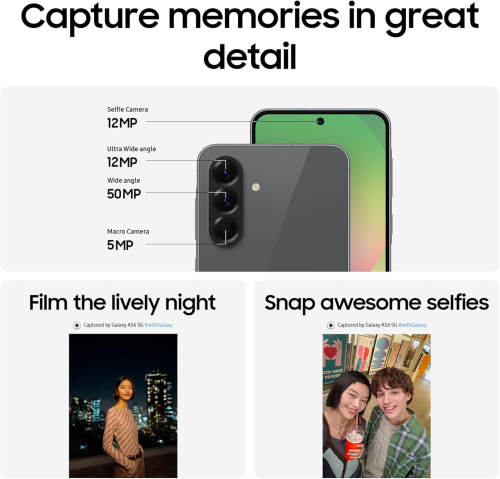 The Samsung Galaxy A56 (8/256 GB) is a 2025 mid-range 5G smartphone featuring a 6.7-inch 120Hz Super AMOLED display (1,200+ nits) with Gorilla Glass Victus+. It is powered by the 4nm Exynos 1580 chipset, offering 8GB RAM, 256GB storage (no microSD), and a 5,000 mAh battery supporting 45W charging. The device features a 50MP main camera, a 12MP ultrawide, and a 12MP front camera with 4K video recording.