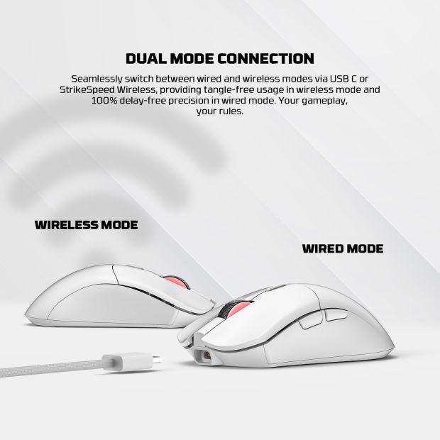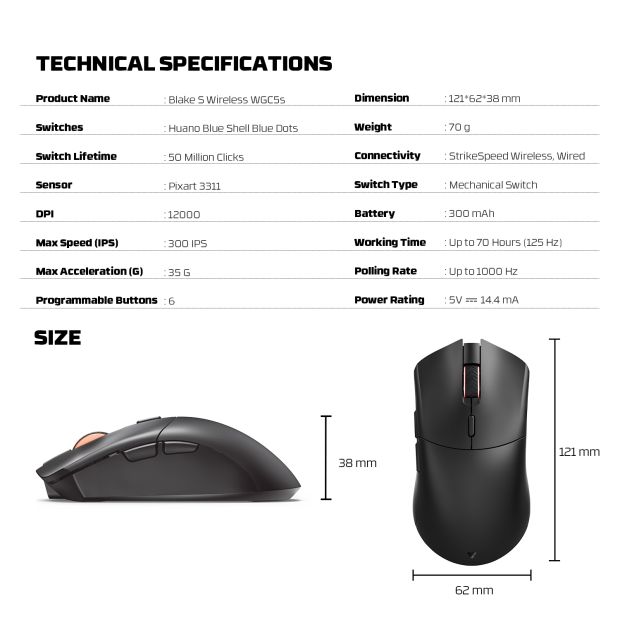 Connectivity – Wired Type-C, 2.4GHz Wireless Sensor Type – Optical Sensor – Pixart 3325 Sensor Resolution – 12000 DPI Polling Rate – 1000Hz